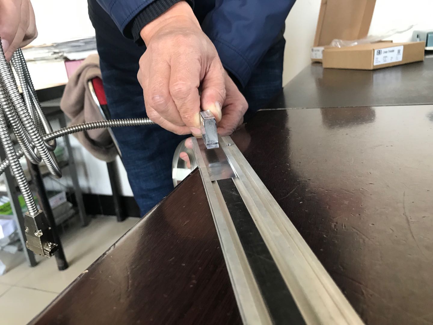 3、将磁栅尺小心粘贴到全封闭尺壳中,并将安装好的磁头小心推入封闭尺壳确保与磁尺保持0.01mm间隙